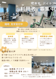 デイケアを支えて下さるボランティアを募集しています。デイケアに参加されている方のリハビリのため、介助して下さる方、趣味や特技をお持ちの方は是非ご協力下さい。